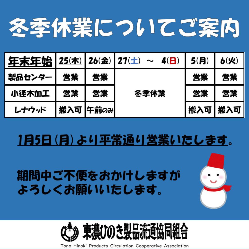 年末年始休業のご案内 投稿日: 2025年12月25日 年末・年始は下記の通り休業となりますのでご案内申し上げます。 年始は1月5日(月)から通常営業いたします。 なお、レナウッド白川の木くず受入は12月26日(金)のみ午前中とします。 前の記事へ トピックス一覧へ